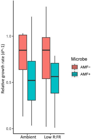 Relative growth rate (RGR) of unparasitized Spodoptera exigua feeding on tomato plants grown under two light (Ambient, Low R:FR) and two inoculation treatments (AMF−: no mycorrhiza, AMF+: mycorrhiza). RGR = (lnW[final]) − lnW[initial])/t. W = weight, t = time in days. The error bar denotes 1SE. No significant differences were observed in RGR across light and inoculation treatments. The median is represented by the thick horizontal line; the box is defined by the 25th and 75th percentiles (lower and upper quartile).