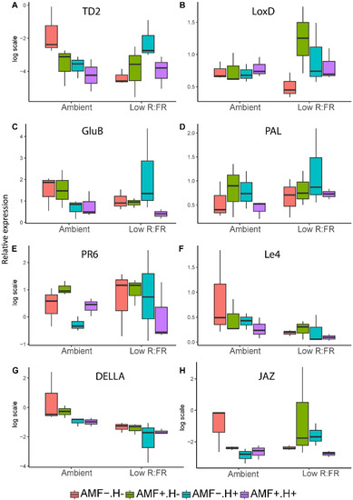 Relative expression of eight genes (A–H) related to light and defense signaling in tomato plants grown under two light (Ambient, Low R:FR) and two inoculation treatments (AMF−: no mycorrhiza, AMF+: mycorrhiza) in the absence (H−) or presence (H+) of herbivory by unparasitized Spodoptera exigua caterpillars. Values are delta-delta-Ct values normalized to the expression of the housekeeping gene CAC. The median is represented by the thick horizontal line; the box is defined by the 25th and 75th percentiles (lower and upper quartile).