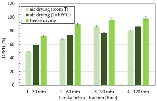 The results of DPPH * radical scavenging activities of supercritical extracts of Istrska belica are presented in Figure 1. Samples differed according to the method of drying (air—room temperature, dryer—air (T = 105 °C), lyophilization) and fractions obtained at 30 min, 60 min, 90 min, and 120 min. Inhibition of Istrska belica extracts varies between 49% and 98%, depending on the time of extraction and type of drying. The highest DPPH activity was determined in extracts of leaves dried in a freeze dryer, followed by extracts obtained from leaves dried in a dryer (T = 105 °C), and the lowest antioxidant activity in air-dried leaves. It can be seen from the Figure 2 that Leccino extracts had lower DPPH activity than Istrska belica.