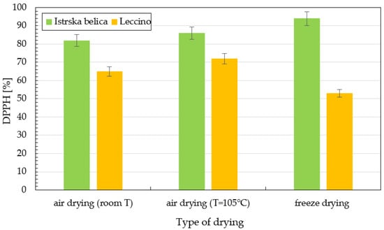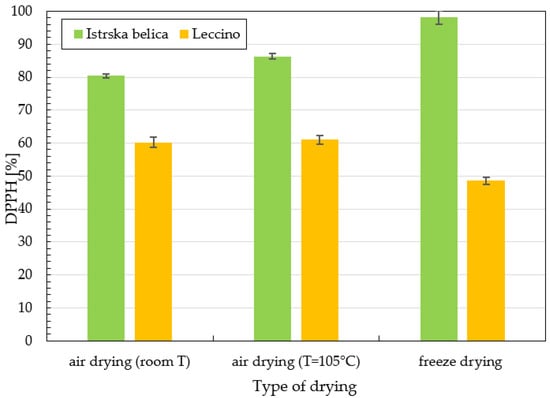 DPPH activity is presented in Figure 4. Leccino extracts have much lower antioxidant activity compared to Istrska belica. For Istrska belica, the highest values were obtained in the case of freeze drying (around 94%), followed by drying at T = 105 °C (86%) and drying in air, whereby antioxidant activity was around 82%. On the other hand, the highest DPPH activity of 72% for Leccino was obtained in the case of air drying at 105 °C.