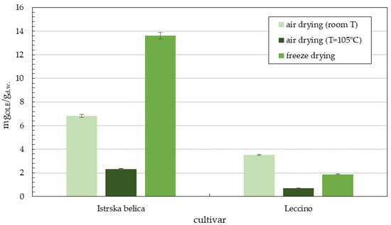 Besides the low solvent polarity, low extraction temperature may have also contributed to the low extraction yield. The highest yield, approx. 12.6%, has was attained by Istrska belica. In the case of Istrska belica, the highest extraction yield was achieved in the case of air drying at room temperature, followed by lyophilization and drying at a temperature of 105 °C. Generally, the lowest extraction yield was found in the case of drying leaves at 105 °C for both cultivars.