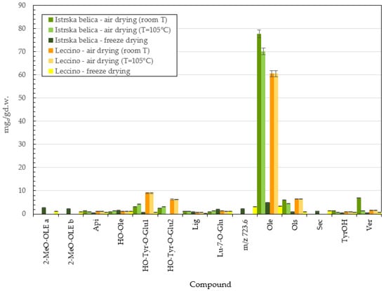 Comparison of oleuropein content (mgOLE/g d.w.) in extracts of Istrska belica and Leccino obtained by SCE extraction after 90 min for different methods of drying. Data are means ± SD from three replicates.