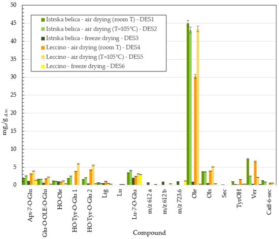 Deep eutectic solvent (DES) was prepared with glycerol, glycine, and water (Gli:Gly:H2O = 7:1:9). Extracts were analyzed with the HPLC method, and the influence of the type of drying on the concentration of phenolic components was studied for Istrska belica and Leccino cultivars. Results are presented in Figure 6 and in Table S2.