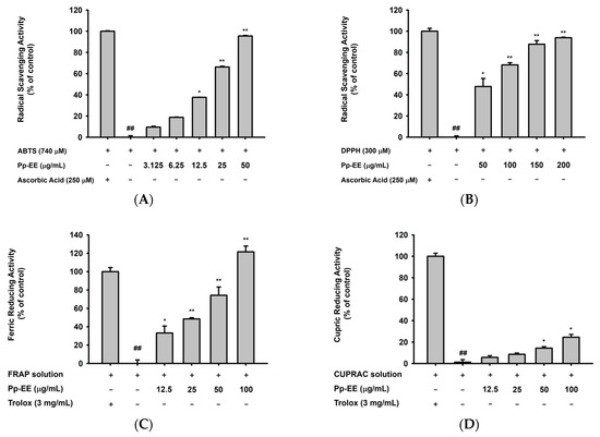 The ABTS radical scavenging activity of the extract was determined according to the Re et al. method [74]. This method is based on the change from the blue-green ABTS•+ to the pale blue ABTS in the presence of an antioxidant. ABTS was dissolved in distilled or deionized water to a 7 mM concentration. Then, the ABTS solution was mixed with 2.45 mM potassium persulfate in a ratio of 1:0.5 to generate ABTS•+ radical cations, which are blue-green. That ABTS•+ solution was incubated for 12–16 h at room temperature and then diluted with distilled or deionized water to yield an absorbance of 0.70 at 734 nm when diluted in half. Different concentrations of Pp-EE (3.125–50 μg/mL, previously prepared at a concentration of two times in distilled or deionized water) were mixed with the ABTS•+ solution in a ratio of 1:1, and the reaction mixtures were incubated for 15–30 min. After incubation, the absorbance of the reaction mixtures was measured at 734 nm. Ascorbic acid (250 μM) was used as the reference compound [75].