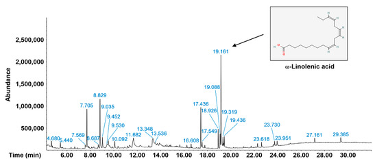 We also analyzed the phytochemical components of Pp-EE using gas chromatography–mass spectrometry (GC-MS). A major compound was 9,12,15-octadecatrienoic acid, (Z,Z,Z)-, also known as α-linolenic acid (Figure 2). α-Linolenic acid is a plant-based essential omega-3 polyunsaturated fatty acid. The beneficial pharmacological activities, such as anti-inflammatory, antidepressant, neuroprotective, and cardioprotective actions, of α-linolenic acid have been previously demonstrated [37,38,39,40]. In particular, it has been also found that α-linolenic acid can inhibit melanin production, showing its potential in the prevention of ultraviolet-induced skin hyperpigmentation [41]. The other compounds in Pp-EE are listed in Table 2.