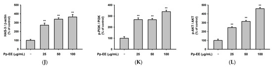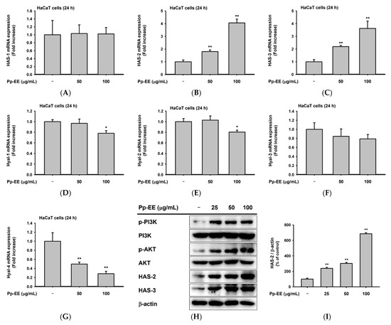 We evaluated the effects of Pp-EE on parameters that are closely related to skin moisturization. HaCaT cells that produce HA were used to check the skin moisturizing effect of Pp-EE [42]. To evaluate the effect of Pp-EE on the expression of mRNA related to skin moisturize, we assessed the mRNA expression of HAS-1, -2, and -3 after HaCaT cells were treated with 50 and 100 μg/mL of Pp-EE. The mRNA level of HAS-1 did not change after the Pp-EE treatment, but Pp-EE increased the mRNA expression of HAS-2 and HAS-3 in a dose-dependent manner (Figure 3A–C). We also checked the mRNA expression of hyaluronidase (Hyal) genes. Hyal-1, 2-, and -4 were decreased by Pp-EE (Figure 3D–G). In other words, keratinocytes exposed to Pp-EE increased the expression of an enzyme that synthesizes HA and decreased the expression of an enzyme that degrades HA. HAS-2 and HAS-3, which showed increased expression at the mRNA level upon Pp-EE exposure, were also investigated at the protein level. Pp-EE dose-dependently increased the protein levels of both HAS-2 and HAS-3 in HaCaT cells (Figure 3H–L). The protein level of phospho-AKT, which regulates the expression of HAS-2 [43], increased upon Pp-EE exposure, as did the protein expression of phosphorylated phosphoinositide 3-kinase (PI3K), which regulates the phosphorylation of AKT (Figure 3H,K,L).