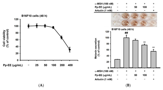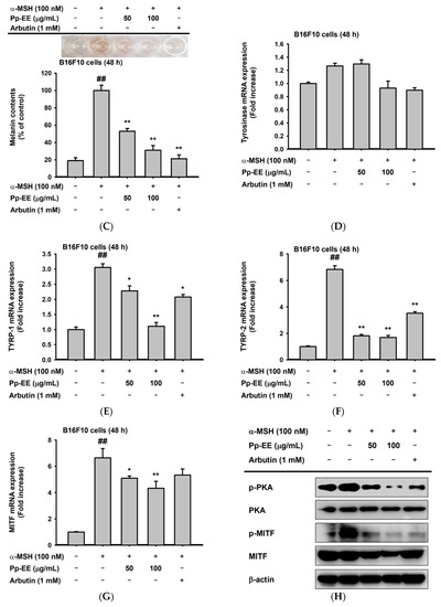 B16F10 cells were seeded in 96-well plates at a density of 6 × 104 cells/mL and incubated overnight. The cells were treated with Pp-EE (0, 50, and 100 μg/mL) or arbutin (1 mM) for 48 h with/without α-MSH (100 nM) [81]. To measure the amount of melanin secreted, 100 μL of cell culture medium was transferred to a 96-well plate, and the absorbance was detected at 457 nm. For the melanin content measurement, the cells were harvested with 500 μL of cold PBS and moved to e-tubes and then centrifuged to discard the PBS. The cells were lysed with 50 μL of cell lysis buffer (50 mM Tris-HCl pH 7.5, 20 mM NaF, 25 mM β-glycerophosphate pH 7.5, 120 mM NaCl, and 2% NP-40), followed by centrifugation (12,000× g) for 10 min. The supernatant was removed, and the pellet was dissolved with 100 μL of 1 M NaOH containing 10% DMSO at 50 °C for 30 min. Finally, 80 μL of the reactant was distributed in a 96-well plate, and the absorbance was detected at 405 nm.