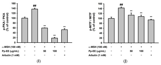 α-MSH stimulates melanocytes to induce melanogenesis. Because hyperpigmentation occurs when the biosynthesis of melanin is increased, checking a substance’s anti-melanogenic effect is one meaningful way to evaluate its whitening efficacy [44]. Arbutin is widely used as a whitening agent and suppresses melanin biosynthesis by inhibiting the activity of tyrosinase [45]. To investigate the anti-melanogenesis efficacy of Pp-EE, B16F10 cells were treated with α-MSH to induce melanogenesis and treated during 48 h with Pp-EE at concentrations of 50 and 100 μg/mL to determine whether it inhibited melanin biosynthesis. Arbutin was used as the positive control. When Pp-EE was administered, the amount of melanin secreted from the B16F10 cells was suppressed dose-dependently. Similarly, the amount of melanin in B16F10 cells also decreased dose-dependently upon Pp-EE exposure (Figure 4B,C). To understand the mechanism by which Pp-EE inhibits melanin production, we checked the mRNA expression levels of genes in the signaling pathway by which melanin is produced by α-MSH. As before, B16F10 cells were treated with α-MSH and 50 or 100 μg/mL of Pp-EE, and arbutin was used as the positive control. α-MSH treatment increased the mRNA expression of tyrosinase and TYRP-1 and -2, which are directly involved in melanin production, and Pp-EE suppressed the increase in those mRNA expression levels except for tyrosinase (Figure 4D–F). The mRNA expression level of MITF, which regulates the expression of tyrosinase and TYRP-1 and -2, was also upregulated by α-MSH and downregulated by Pp-EE (Figure 4G). To examine the mechanism of melanogenesis inhibition by Pp-EE at the protein level, we investigated the phosphorylation of proteins involved in melanin biosynthesis. B16F10 cells were treated with Pp-EE at a concentration of 50 or 100 μg/mL (1 mM arbutin was the positive control), and melanogenesis was induced by α-MSH. The phosphorylation of MITF, a transcription factor that plays a major role in melanin production, was inhibited by Pp-EE (Figure 4H,I). In addition, Pp-EE treatment reduced the activation of PKA, one of the main molecules in the melanogenesis pathway (Figure 4H,J).