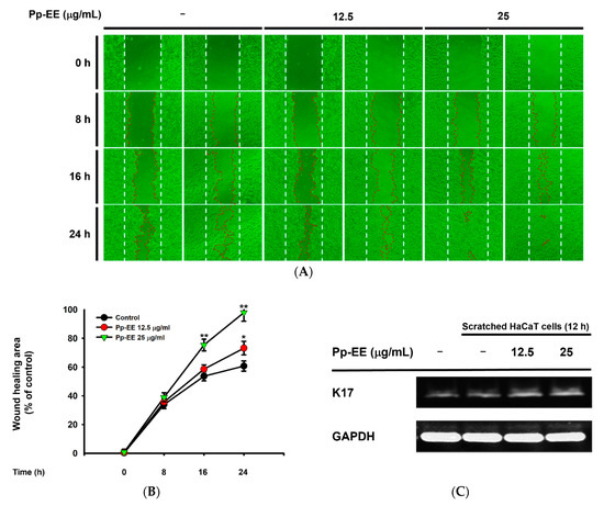 HaCaT cells were seeded at a density of 4 × 104 cells/mL in a 6-well plate, and complete confluence was obtained after 48 h. Scratch wounds were created mechanically with a sterile pipette tip (Ø = 0.1 mm) and uniformly made to be 0.5–0.9 mm in width, as reported previously [82]. The cells were washed with PBS to remove detached cells and debris and then treated with Pp-EE (12.5 and 50 μg/mL). Each scratched region was photographed by microscope (Nikon, Tokyo, Japan) after 0, 8, 16, and 24 h.