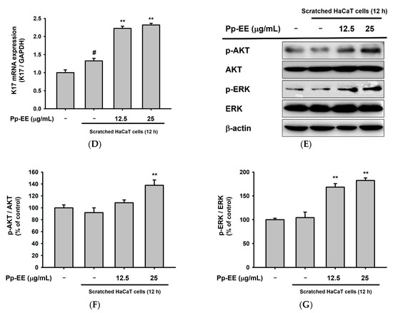 Pp-EE promotes wound-healing processes in keratinocytes. (A) The wound-healing activity of Pp-EE in HaCaT cells was evaluated using an in vitro scratch assay. (B) The scratch area closed by Pp-EE was determined using ImageJ. (C) Confluent HaCaT cells were scratched several times and then treated with Pp-EE (0, 12.5, and 25 μg/mL) for 12 h. The mRNA expression of K17 was measured by RT-PCR. (D) The relative intensities of K17 mRNA were determined using ImageJ. The fold increase represents the ratio of the increased mRNA expression level of scratched groups to the mRNA expression level of the normal group. (E) Several scratches were created on confluent HaCaT cells, which were then treated with Pp-EE (0, 12.5, and 25 μg/mL) for 12 h. The total and phosphorylated forms of AKT and ERK were measured in an immunoblotting analysis. (F,G) The relative intensities of the immunoblots were determined using ImageJ. All the results are expressed as the mean ± standard deviation. # p < 0.05 compared with the normal group, and * p < 0.05, ** p < 0.01 compared with the control group.