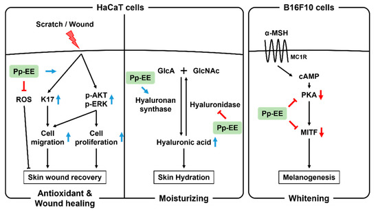 Taken together, the results of this study demonstrate that Pp-EE has an antioxidant capacity, moisturizing, whitening, and wound-healing effects that may delay skin aging as summarized in Figure 6. These effects are closely related to anti-aging, suggesting that Pp-EE can be used as a raw material for cosmetics intended to inhibit skin aging.