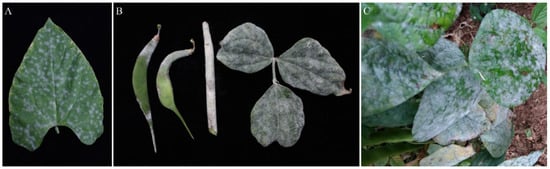 The infected leaves initially showed slightly darkened spots on the upper surface, which then developed into white mildew blotches (Figure 1A). The blotches expanded and merged to form a white mildew layer covering the whole leaf surface (Figure 1B,C). Severely infected leaves turned yellow, died, and fell off (Figure 1C). As the disease progressed, the pods and stems became infected, and eventually the diseased tissues were covered with white mildew (Figure 1B).
