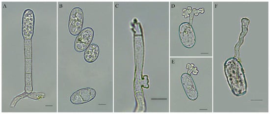 Morphology of Erysiphe vignae on common bean. (A) Conidiophore with attached conidium; (B) Conidia; (C) Hyphal appressorium; (D,E) Conidia with a germ tube germinating on a glass slide; (F) Conidium with a germ tube from diseased leaf; Bars = 10 μm.