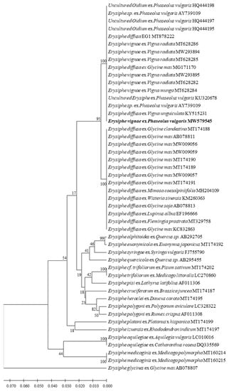 - Takamatsu, S.; Taguchi, Y.; Shin, H.D.; Paksiri, U.; Limkaisang, S.; Binh, N.T.; Sato, Y. Two Erysiphe species associated with recent outbreak of soybean powdery mildew: Results of molecular phylogenetic analysis based on nuclear rDNA sequences. Mycoscience 2002, 43, 333–341. [Google Scholar] [CrossRef]