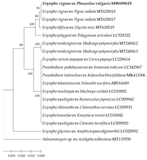 - Saenz, G.S.; Taylor, J.W. Phylogeny of the Erysiphales (powdery mildews) inferred from internal transcribed spacer ribosomal DNA sequences. Can. J. Bot. 1999, 77, 150–168. [Google Scholar] [CrossRef]
