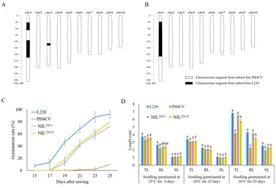 Characteristics of L220, PH4CV, and their near-isogenic lines NIL220-3 and NIL220-25. (A,B) Genomic composition of NIL220-3 (A) and NIL220-25 (B). Blank represents regions homozygous with PH4CV, and black represents homozygous regions from L220. (C) Emergence rate of seed germinated at 10 °C for 15–25 days. (D) Total length (TL), root length (RL), and shoot length (SL) of seedling germinated at 25 °C for 3 days, and at 10 °C for 15 and 25 days. Values represent mean ± SE (n = 3). Different letters indicate significant difference at p ≤ 0.05 within a trait among different genotypes that germinated in the same condition.