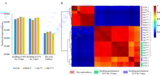Identification of expressed genes from L220, PH4CV, and their near-isogenic lines NIL220-3 and NIL220-25. (A) The number of expressed genes identified from different genotypes that germinated at 10 °C for 15 days and 25 °C for 3 days, and ungerminated dry embryo. Data were the average of two replications. (B) Heatmap clustering of the expressed genes. Pink, green, and blue columns presented vertically at the right side of the heatmap represent samples collected from dry embryo, seedlings germinated at 10 °C for 15 days, and seedlings germinated at 25 °C for 3 days, respectively. Red and blue represent high and low abundance, respectively, according to the normalized FPKM. The numbers 1 and 2 after the genotype represent replicates 1 and 2, respectively.