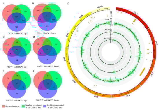 Differentially expressed genes (DEGs) retrieved from L220, NIL220-3, and NIL220-25 as compared to PH4CV at different germination conditions. (A–F) Venn diagram illustrating the up- and downregulated DEGs in L220 (A,B), NIL220-3 (C,D), and NIL220-25 (E,F) as compared to PH4CV at dry seed embryo stage (red cycle), and seedlings germinated at 25 °C for 3 days (blue cycle) and at 10 °C for 15 days (green cycle). (G) Distribution of tolerant line (L220, NIL220-3, and NIL220-25) specifically expressed LTGA genes on the maize genome. Circles from outer to inner showed reference genome (B73, AGPv4), QTLs identified for cold germination in a previous study [], tolerant line (L220, NIL220-3, and NIL220-25) specifically expressed gene number in the 1 Mb bin region. Positive or negative numbers indicated up- or downregulated genes.