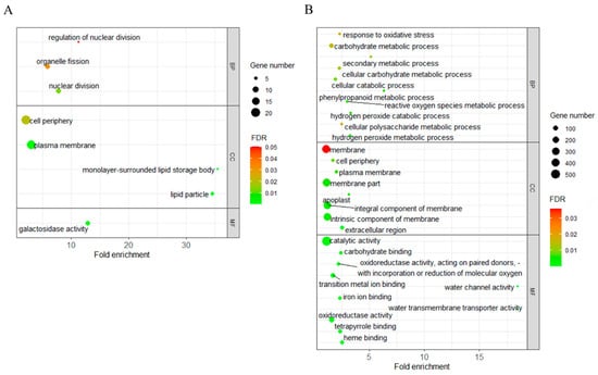 GO enrichment analysis of L220-specifically expressed LTGA genes (DEGs) with up- (A) and downregulated (B) expression. The size of the dot indicates the number of DEGs involved in the GO category. The color scale indicates the significance level (FDR). The rich factor is the ratio between the number of DEGs and all genes enriched in the category.