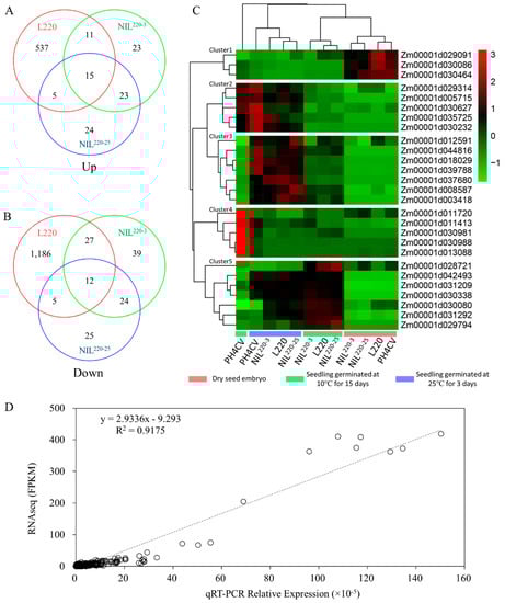 To validate the gene expression level from RNA sequencing, 27 commonly expressed genes among L220 and NILs at low temperature were subjected to quantitative real-time PCR analysis using QuantStudio 6 (Thermo Fisher, Waltham, MA, USA). The maize ZmGAPDH served as an endogenous control. cDNA was synthesized from the RNA prepared for RNA sequencing. Primers used for qRT-PCR are listed in Supplementary Table S8. Three biological replicates were conducted and each biological replicate was technically repeated three times. The 2−ΔCT method was used to calculate gene transcript relative abundance [].