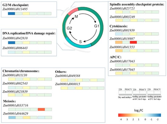 The method of eukaryotic cell division is mitosis, which would be arrested at G1/S phase by low temperature []. Additionally, the expression of genes related to cell cycle control, cell division, and chromosome partitioning changed in response to low temperature, which probably increased plant tolerance to low temperature stress []. In this study, 17 cell-division-related genes exhibited higher expression in L220 than in PH4CV under the low temperature germination condition (Figure 6 and Supplementary Table S2). Of them, four genes were involved in cell cycle regulation. Zm00001d013495 encoded a CDT2 protein, whose homolog in HeLa cells functioned in the early G2/M checkpoint [,]. Zm00001d025721 and Zm00001d003249 were spindle assembly checkpoint components, homologous to Mitotic Arrest Deficient 1 (MAD1) and MAD2, respectively, and played a vital role in preventing anaphase onset before correct attachment of all kinetochores to microtubules and generation of tension []. Zm00001d042810 encoded cell division control protein that was crucial for endoreduplication [].