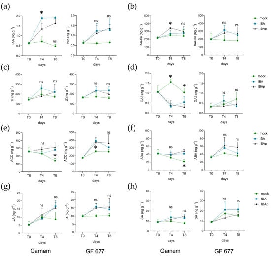 2.2.4. Hormone Profiling of Garnem and GF 677 Microcuttings during IBA-Induced Rooting