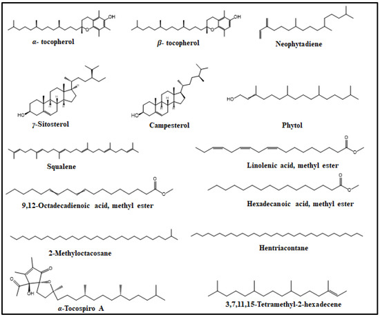 | 11 | 51.97 | β-Tocopherol | C28H48O2 | 3048 | 3043 | 6.07% | MS, RI |
