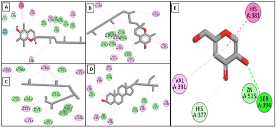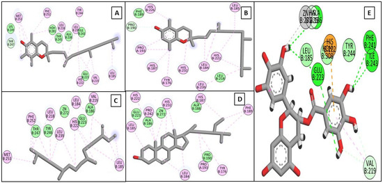 | γ-Sitosterol | −7.66 | ----- | TYR179, LEU184, TYR185, HIS187, PHE189, PRO193, HIS222, HIS232 | −6.10 | ----- | PHE129, LEU132, LEU197, ARG208, HIS223 | −6.90 | ----- | TYR55, TYR184, TYR227, TRP226, TRP301 | −6.84 | ----- | HIS215, PHE362, TYR369, HIS377, HIS381, LEU382, VAL391 |