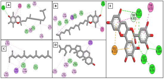 | α-Tocopherol | −9.02 | ----- | LEU185, LEU218, VAL219, LEU239, TYR244, PHE252, MET253 | −6.00 | HIS140, GLU141 | HIS140, HIS223 | −6.40 | SER304 | TYR55, TYR184, TYR227, TRP267, TRP301 | −7.70 | HIS377, HIS381 | HIS215, PHE362, TYR369, HIS381, LEU382 |