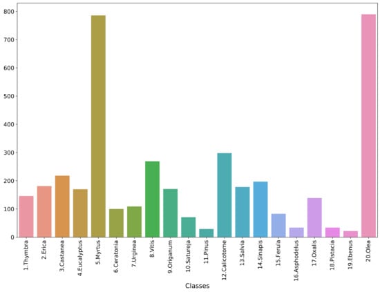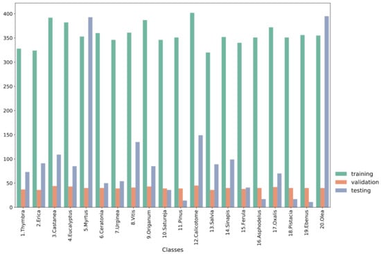 Each model was trained to classify the pollen-grain images into one of the 20 plant species. The training, validation and testing sets comprised 7129, 802 and 2013 pollen-grain images, respectively. The specific distribution of each class is presented in Figure 3. The validation set was used for assessing the performance during training and for early stopping of the training procedure. Table 4 presents the overall performance results averaged across all classes for each of the models, while Table 5 presents the performance of each model regarding the Thymbra class. For the sake of brevity, the model performances on the rest of the classes are presented in their respective tables in the Supplementary Materials. We chose to include the performance regarding the Thymbra class in the main part of the paper because it is the main pollen type present in Crete’s trademark honey “Pefkothymaromelo Kritis PDO”.