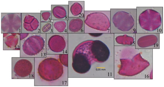 Mosaic of images of all pollen types: 1 Thymbra; 2 Erica; 3 Castanea; 4 Eucalyptus; 5 Myrtus; 6 Ceratonia; 7 Urginea; 8 Vitis; 9 Origanum; 10 Satureja; 11 Pinus; 12 Calicotome; 13 Salvia; 14 Sinapis; 15 Ferula; 16 Asphodelus; 17 Oxalis; 18 Pistacia; 19 Ebenus; 20 Olea.