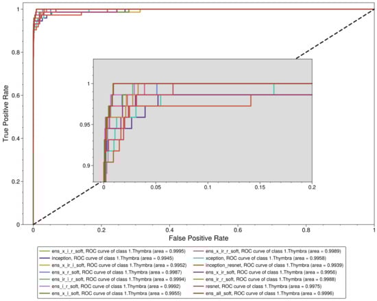 We observe that all the models performed exceptionally well in the aggregated results (Table 4), with a weighted mean AUC value of 0.99895 ± 0.00054, a macro AUC value of 0.99898 ± 0.00047, a weighted mean sensitivity value of 0.96839 ± 0.00663 and a macro mean sensitivity value of 0.96237 ± 0.00739. However, the same does not apply for the Thymbra class evaluation. Although the mean AUC value of all models was 0.997295 ± 0.002001, the mean sensitivity was 0.895548 ± 0.04364. Interestingly, the base models (Inception v3, Inception–ResNet, Xception and ResNet) had a mean sensitivity value of 0.8869865 ± 0.0326692, the hard voting ensemble classifiers had a mean sensitivity value of 0.8712329 ± 0.050592 and the soft voting ensemble classifiers had a mean sensitivity value of 0.9232878 ± 0.0139697. In fact, the Xception–Inception soft voting ensemble model (“ens_x_i_soft”) had the highest sensitivity value of 0.945205 of all the models, while the highest sensitivity for a hard voting ensemble was 0.931507. Thus, soft voting ensemble classifiers should be preferred to hard voting classifiers in the context of this study. The receiver operating characteristic (ROC) analysis regarding the Thymbra class is presented in Figure 4.