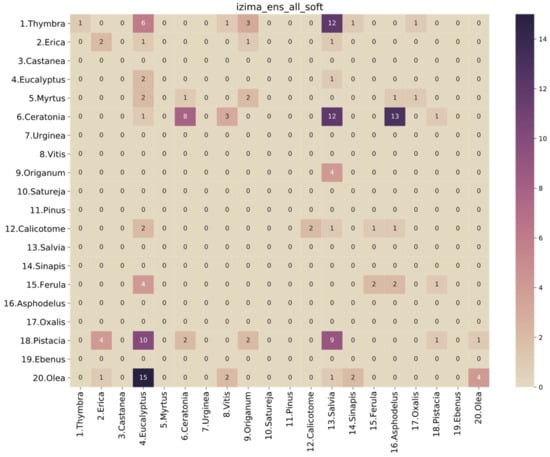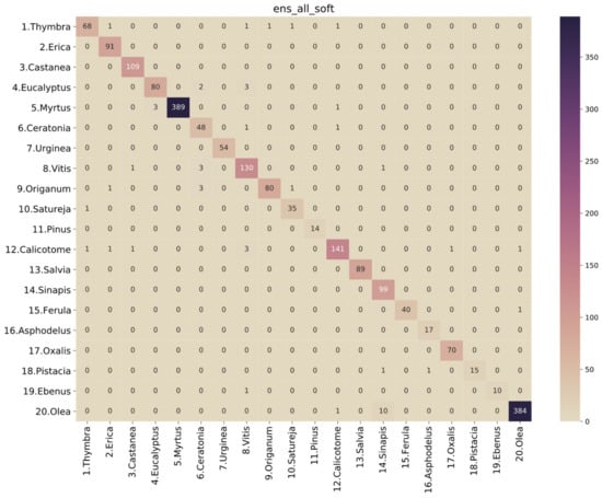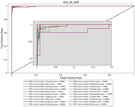 Thus, based on the previous assumptions and observations, the best-performing model is a soft voting ensemble of all the base models (“ens_all_soft”). The ROC analysis is presented in Figure 5, and the performance metrics are presented in Table 6. Looking at the confusion matrix of this classifier in Figure 6, we observe that there are only a few misclassified cases for all classes. Specifically, for Thymbra, there were 5 pollen-grain images that were classified as Erica, Vitis, Origanum, Satureja and Calicotome, while 68 were correctly classified as Thymbra. On the other hand, there were only 2 pollen-grain images that were falsely classified as Thymbra, when in fact they belonged to Satureja and Calicotome pollen types, respectively. Such misclassifications may be attributed to the fact that several pollen species such as Thymbra, Origanum and Salvia have shared morphological characteristics.
