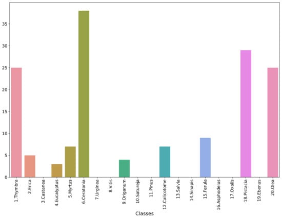To evaluate the model in a real-life setting, 17 samples were collected from two different honey samples. Pollen grains were isolated according to []. In brief, 10 g of honey was dissolved in deionized water and centrifuged to remove the sugars. The sediment was used to make microscopic preparations with the addition of 0.05% pararosaniline chloride (Acros Organics, Mumbai, India). The slides were placed in a heating hearth at 40 °C to evaporate the moisture, followed by closing the sample using coverslips and mounting medium (Eukitt, Sigma-Aldrich, Tafkirchen, Germany). Permanent pollen preparations were allowed to dry before storage. The images were acquired using a Kern Optics microscope with a built-in ODC 832 camera, with 5.1 MP at 400× magnification. After the images were taken, the granules were identified by a specialist scientist. The images were processed to segment each pollen grain and then standardized according to the preprocessing pipeline of the analysis presented in Section 2. The final data comprised a total of 152 pollen-grain images, with a distribution across the classes as shown in Figure 7. This is a very imbalanced collection, with many classes not having a single data point. The best-performing model from the test set, i.e., the “ens_all_soft” classifier, was used to predict the classes of the pollen-grain images derived from the honey samples. It should be stressed that this is a preliminary case study, since the collected samples were not sufficient to produce reliable and trustworthy results. Hence, we chose to include it in the Discussion section of this manuscript as an indication of future research directions.