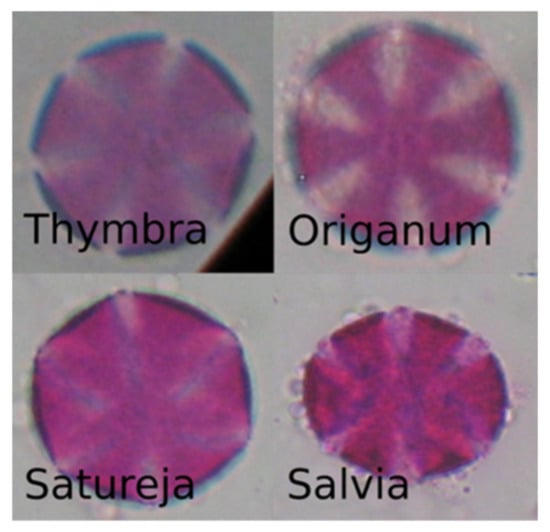 Honey is a natural, sweet food produced by bees from the nectar of plants and/or from the secretions of plants and insects. It is a complex mixture, with excellent healing properties and nutrients, and plays an increasing part in the human diet [,]. Due to the great variety of melliferous plants, there is high variability among honeys regarding their composition. A honey can be considered to be unifloral or monofloral when honeybees collect mainly from one floral source. To certify the botanical origin of honey, physicochemical analyses are combined with the investigation of the pollen contained in the honey. Pollen analysis (also known as melissopalynology) is a procedure for identifying the pollen grains present in the honey sediment after dilution and centrifugation. The sediment is examined under a microscope by a specialist scientist, who identifies the granules according to their morphological characteristics. This process has been performed manually to date, although it is very time-consuming. For this reason, there is a need to find a method that will automate and speed up the process, while reducing the potential human error. Pollen analysis is a necessary procedure for characterizing the origin of honey. Among other things, geographical identification is possible, according to the flora of each place. Specifically, the region of Crete presents a unique floral diversity with a significant number of endemic plants from which honey is produced, with special organoleptic and physicochemical characteristics. Such products need protection to prevent fraud and the misleading of consumers.