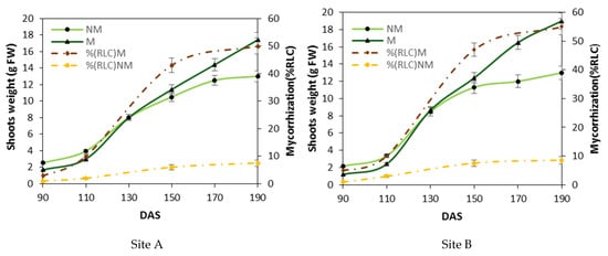 Differences in the aerial biomass weight between mycorrhized and non-mycorrhized plants. Shoot weights (a mean of ten shoots were in each parcel of control (NM) and mycorrhized plants (M)) and the corresponding root length colonization (% RLC) between 90 and 190 days after sowing (DAS) at two separate locations (Larino, Site A; Rotello, Site B). The mycorrhization index (dashed line) is expressed as a percentage of root length colonization % RLC by mycorrhizae. Bars indicate the standard deviation (±SD), and the means are the mean values of ten plants (n = 10) randomly distributed in the experimental parcel.