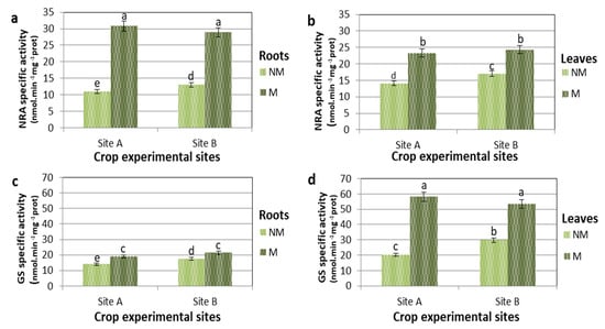 Nitrate reductase (NRA) and Glutamine synthetase (GS)specific activities of control (NM) and M plants of Triticum durum grown in two different soil sites (A and B) and collected at 190 DAS. Data are for NRA in roots (a) and in leaves (b), and GS in roots (c) and leaves (d). Specific activities are expressed in nmol min−1 mg−1 protein. The values are means ± SD of ten biological replicates (n = 10). Values marked by common letters are not statistically different at p ≤ 5% according to Tukey’s test.
