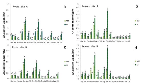Amino acid concentrations of roots and leaves tissue of Triticum durum of control (NM) and mycorrhizal (M) treatments 190 d after sowing in two different soil sites (A and B; (a,c) refer to the roots, while (b,d) to the leaves). The values are means ± SD of ten plants (n = 10) in each experimental parcel. Bars indicate the standard deviation. Values marked by common letters are not statistically different at p ≤ 5% according to Tukey’s test.