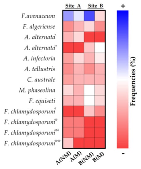 Nine endophytic fungal taxa were isolated from the roots of 20 plants randomly distributed in the two investigated sites (Table 1). Alternaria and Fusarium were the two most common genera that were detected in the roots of many plant species. Fusarium species were observed in all the sites studied, while Alternaria species were mostly isolated in plant roots from site B. Besides those two genera, the fungi of the Cladorrhinum macrophomina species were detected in the samples examined by root isolation and ITS pyrosequencing with different frequencies. The fungi of Cladorrhimum australe, Macrophomina phaseolina, Fusarium equiseti and F. avenaceum species were isolated much more from the plant roots of site A (NM), with a percentage of frequency on 20 plants examined being 5%, 75%, 70% and 90%, respectively. The fungi of Alternaria alternata, A. infectoria, F. equiseti and F. avenaceum species were isolated much more from the plant roots of the A (M) site, with a percentage of frequency of 20 plants examined being 50% 55%, 40% and 55%, respectively. On the other hand, in the plant roots of the B (NM) site, the most significant attendance rates were in favor of F. avenaceum, M. phaseolina, F. equiseti and F. algeriense (85%, 50%, 50% and 40%, respectively) and in the plant roots of site B (M), in favor of A. alternata, A. infectoria, F. avenaceum and M. phaseolina (50%, 45%, 40% and 40%, respectively), as indicated in Table 1. and visibly evidentiable by the chromatism of the heat map Figure 4.