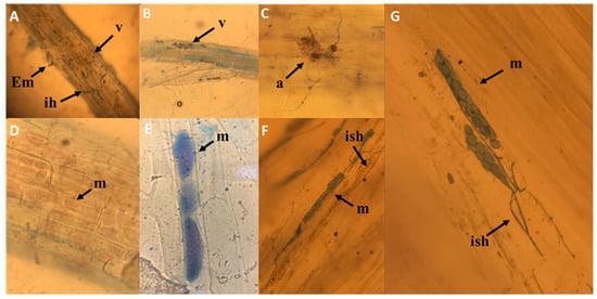 Although to different extents, all root samples examined showed endophyte colonization as observed via direct microscopy (Figure 5). In the seven images of Figure 5, it is possible to note also the presence of mycorrhizal colonization often associated with endophytic colonization in the same roots, highlighting vesicles and arbuscules.