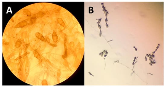 The microsclerotia are the result of single or contiguous hyphae that swell and develop numerous septa. The subsequent lateral sprouting produces groups of spherical cells that subsequently become pigmented. The typical morphology of conidia and the conidial chains of Alternaria spp. From site B (NM) are clearly observed without the aid of histochemical reagents, using an optical microscope (Figure 6).