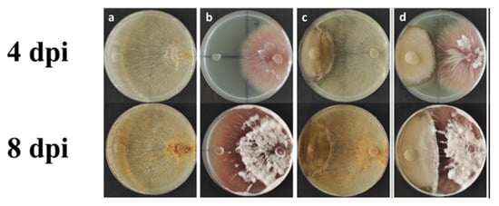 Representative pictures of the antagonistic activity assay via dual culture method at 4 and 8 days post-inoculation (dpi), respectively. (a,b) Control plates of R. solani and F. oxysporum, respectively; (c) dual culture assay of A. telluris and R. solani; (d) dual culture assay of A. telluris and F. oxysporum.