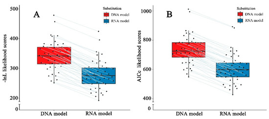 Comparisons of distinct likelihoods obtained from the best-fitting DNA and RNA models. (A) -ln L likelihood; (B) AICc likelihood. The same ITS2 sequence-structure alignments analyzed separately with DNA and RNA-models are connected with lines.