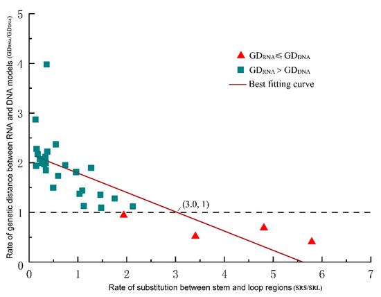 Given that the genetic distance depends on the substitutions within base pairs, we investigated the substitution sites in each ITS2 partition (loop vs. stem regions) separately, counting and comparing their respective raw substitution rates. We found that the GD ratio (GDRNA/GDDNA) decreased as the SRS/SRL ratio (substitution rate in stems/substitution rate in loops) increased. When the SRS/SRL ratio equaled 2.0, the expected result, that GDRNA was lower than GDDNA, began to appear. When the SRS/SSL ratio rose to 3.0, GDRNA was always smaller than GDDNA (Figure 3).