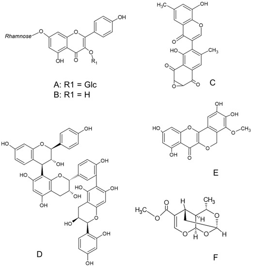 - Pistelli, L.; Bertoli, A.; Zucconelli, S.; Morelli, I.; Panizzi, L.; Menichini, F. Antimicrobial activity of crude extracts and pure compounds of Hypericum hircinum. Fitoterapia 2000, 71, S138–S140. [Google Scholar] [CrossRef]