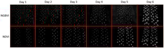 The computer vision process of this project consisted of applying the NDVI algorithm to NGB images and the NGBVI algorithm to RGB images to obtain grayscale images, as shown in Figure 1. As such, twelve grayscale images are shown Figure 1, where Vis are on the rows and time-lapses per day are on the columns.