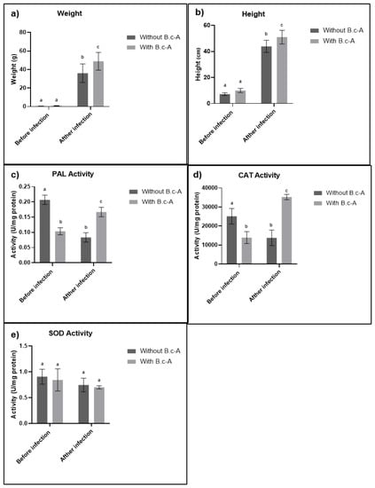 The results showed that before the infection with Cmm, the characteristics of plants, such as weight and height, did not exhibit a significant difference between treatments with or without the inoculation of beneficial bacteria B. c-A; however, 15 days after the infection with Cmm, significant differences in plant weight and height appeared with the beneficial bacteria in comparison with the controls (Figure 2a,b). Regarding the enzymatic activities, PAL and CAT activities before Cmm infection increased in treatments without beneficial bacteria B. c-A, but after infection, the treatments without beneficial bacteria decreased and treatments with beneficial bacteria increased (Figure 2c,d). SOD activity did not display significant differences (Figure 2e).