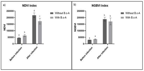 (a) NDVI values before and after infection with Cmm, (b) NGBVI before and after infection with Cmm. Equal letters indicate that there are no statistically representative differences.