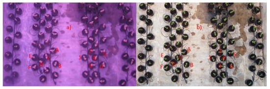 Example of acquired images with both cameras aimed at the same objective. (a) NGB camera image. (b) RGB camera image. Simbology: plants A to F were not inoculated with B. c-A, and plants 1 to 6 were inoculated with B. c-A.