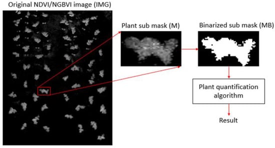 As mentioned above, six plants were selected from each of the two statistical groups for quantification purposes. In order to extract plant features per each specimen, a sub-mask was analyzed separately for each plant under study with the objective of quantifying specific feature values from each plant. Furthermore, a quantification algorithm was applied to each plant mask, as observed in Figure 5, where the plant sub-mask was extracted and further binarized to build the new BW mask. Finally, the quantification algorithm was calculated according to Equation (4), where NBP is the number of non-black pixels, N is the x-size, M is the y-size, and all the non-black pixel values from IMG are accumulated to obtain a quantified result, Q, per plant.